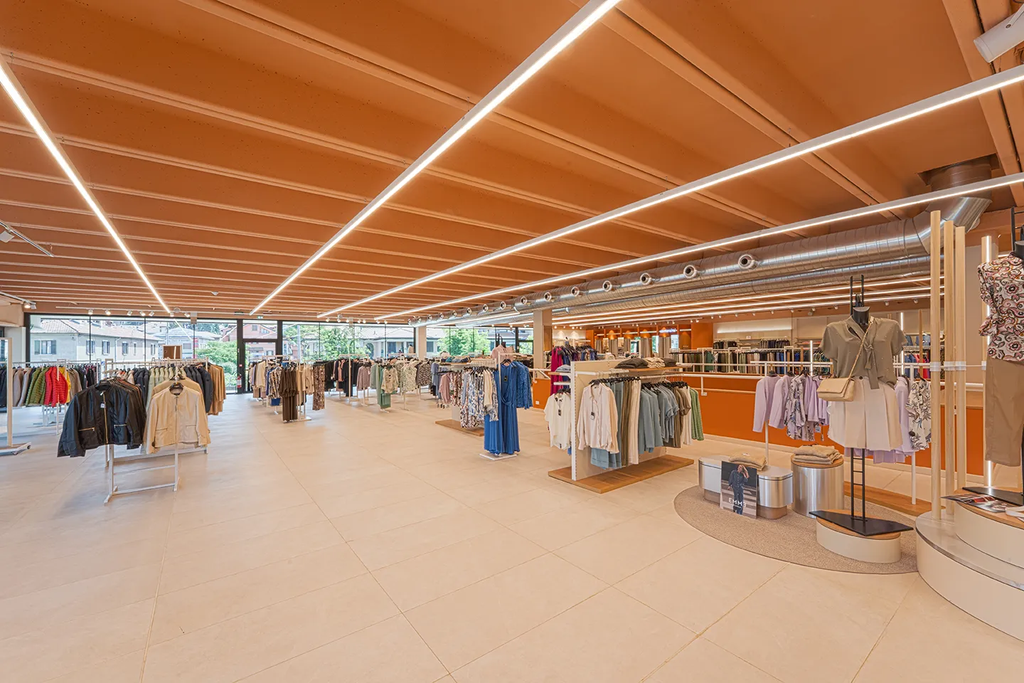 The perimeter band that crowns the building has been extended along the southern and western facades, giving it a more cohesive and symmetrical look. Finished with a wood-effect cladding, it introduces a modern and natural element to the design. Additionally, new heating and cooling systems have been installed on the roof, further boosting energy efficiency and sustainability.